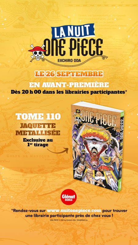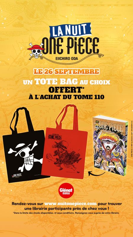 - A partir de 20h00, réouverture exceptionnelle du magasin pour la vente en avant-première du tome 110 de One Piece (paiement en CB uniquement) accompagné de son butin exclusif (Tot-Bag parmi 2 modèles et dans la limite des stocks disponibles)